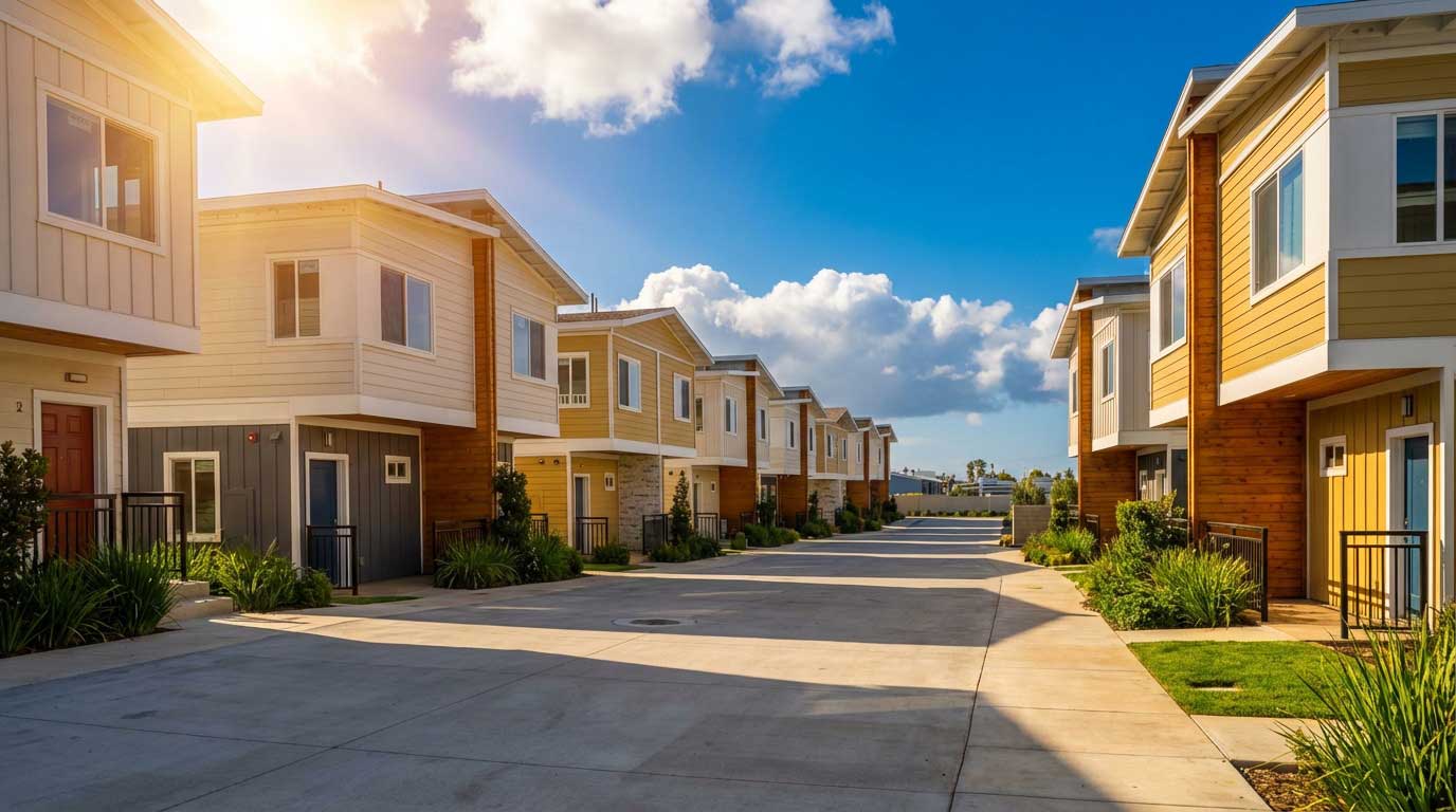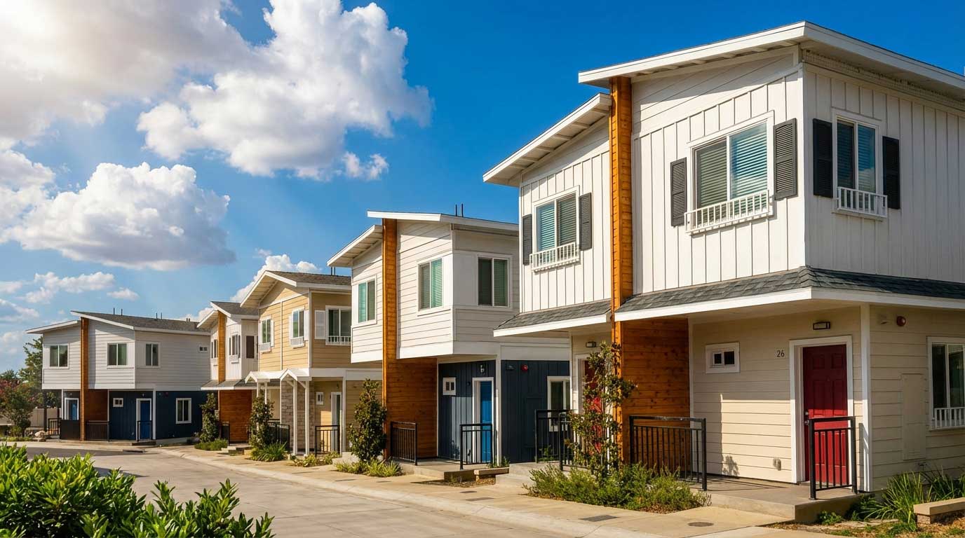 Rows of modular homes delivered and installed, showing density and design cohesion